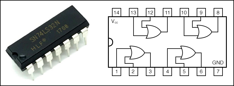 Le raisonnement logique nécessitant de très nombreux transistors, il fut rapidement imagé d'intégrer plusieurs transistors en un seul composant. Et c'est ainsi qu'apparu, en 1958, le premier « circuit intégré » (ou « puce électronique »). Ci-dessous un exemple de circuit intégré comportant 4 fonctions « OU ». Sachant que chacune de ces fonctions est réalisée avec 2 transistors, on en déduit que ce circuit contient 8 transistors (Plus d'autres composants électronique, notamment des résistances) ![]() Circuit "Quad Or Gates - LS 7432" Pour bien comprendre, voyons comment réaliser un circuit électronique « intelligent », à base de transistors, capable de gérer le fonctionnement automatique d'un éclairage d'extérieur :