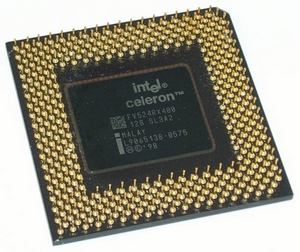 Le nombre de transistors contenus dans les circuits intégrés a rapidement progressé et ces circuits ont évoulé pour devenir des « microprocesseurs » ; ils sont aujourd'hui le cœur des ordinateurs. Celui présenté ci-dessous date des années 1990. Il mesure 1,5 cm² et intègre 1,2 millions de transistors. Il peut assurer 50 millions d'additions par seconde. ![]() Microprocesseur " Intel Celeron "