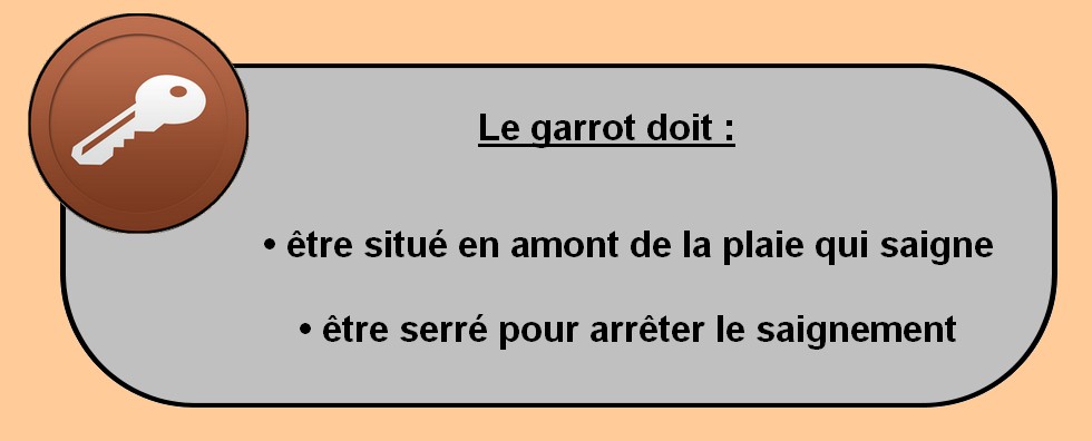 ![]() La pose d'un garrot n'est pas un geste anodin, elle est douloureuse et peut entraîner des complications pour la victime... Le garrot ne doit être mis en œuvre que lorsque le secouriste n'a pas d'autre solution (la compression manuelle est inefficace ou impossible) : - Nombreuses victimes - Lésions multiples - Plaie trop grande
