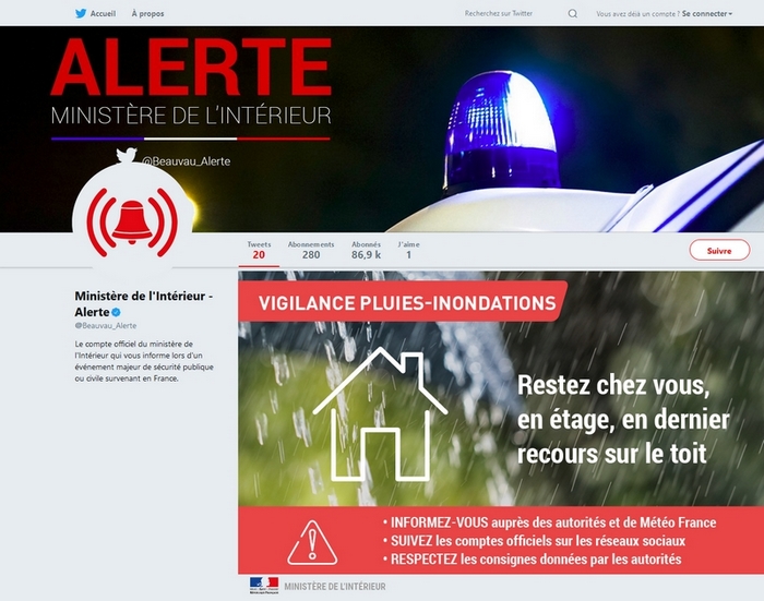 (page officielle du ministère de l'intérieur : www.twitter.com/beauvau_alerte)